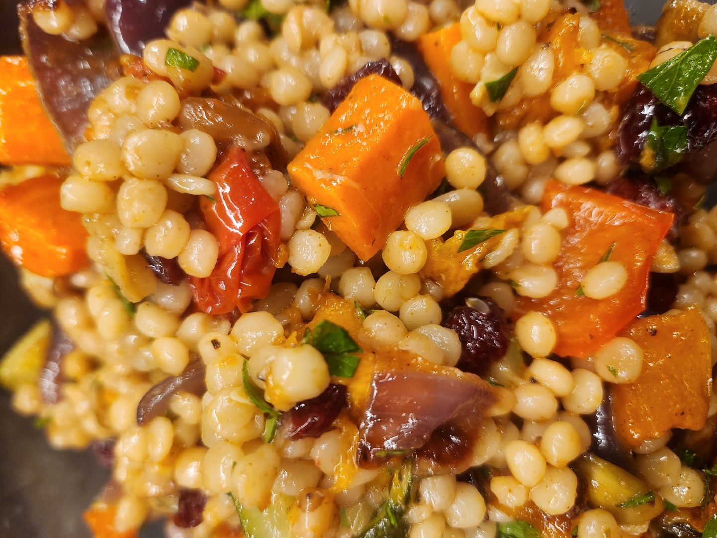 When the vegetables and couscous have finished cooking, put them together into a mixing bowl and have them cool to room temperature. Once cooled, toss with parsley, pumpkin seeds, cranberries, and the balsamic vinaigrette. Serve.