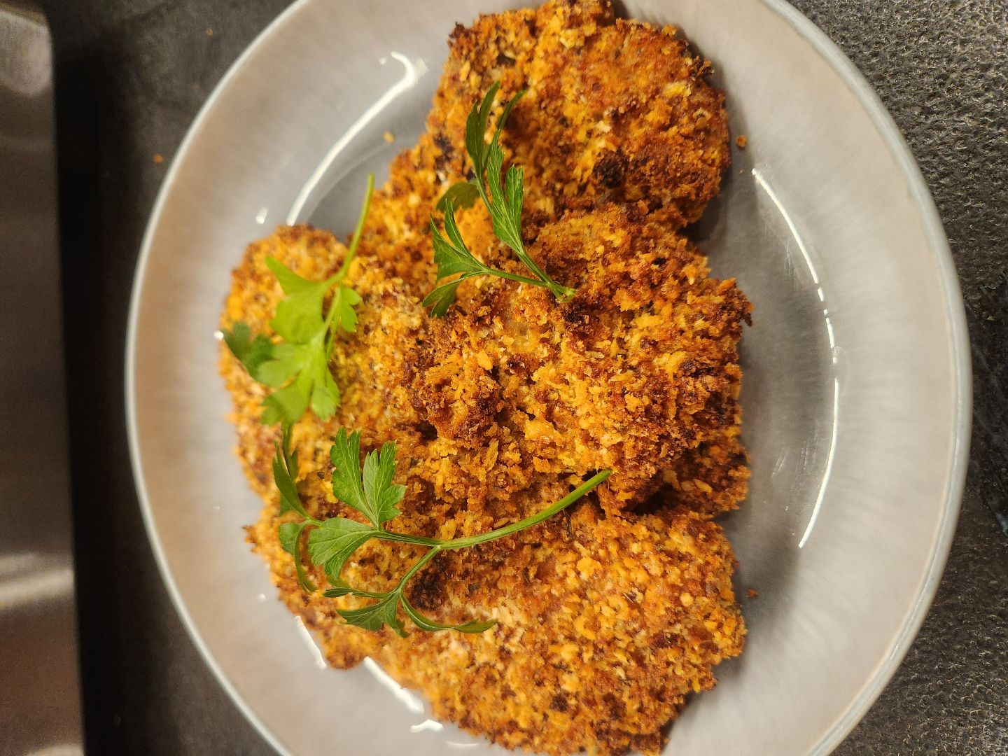 The key here is to flavor each chop with the everything rub and then coat with the breading. Low and slow is the mantra here and this method will reward you with juicy pork chops. Both sides should be a nice golden brown.