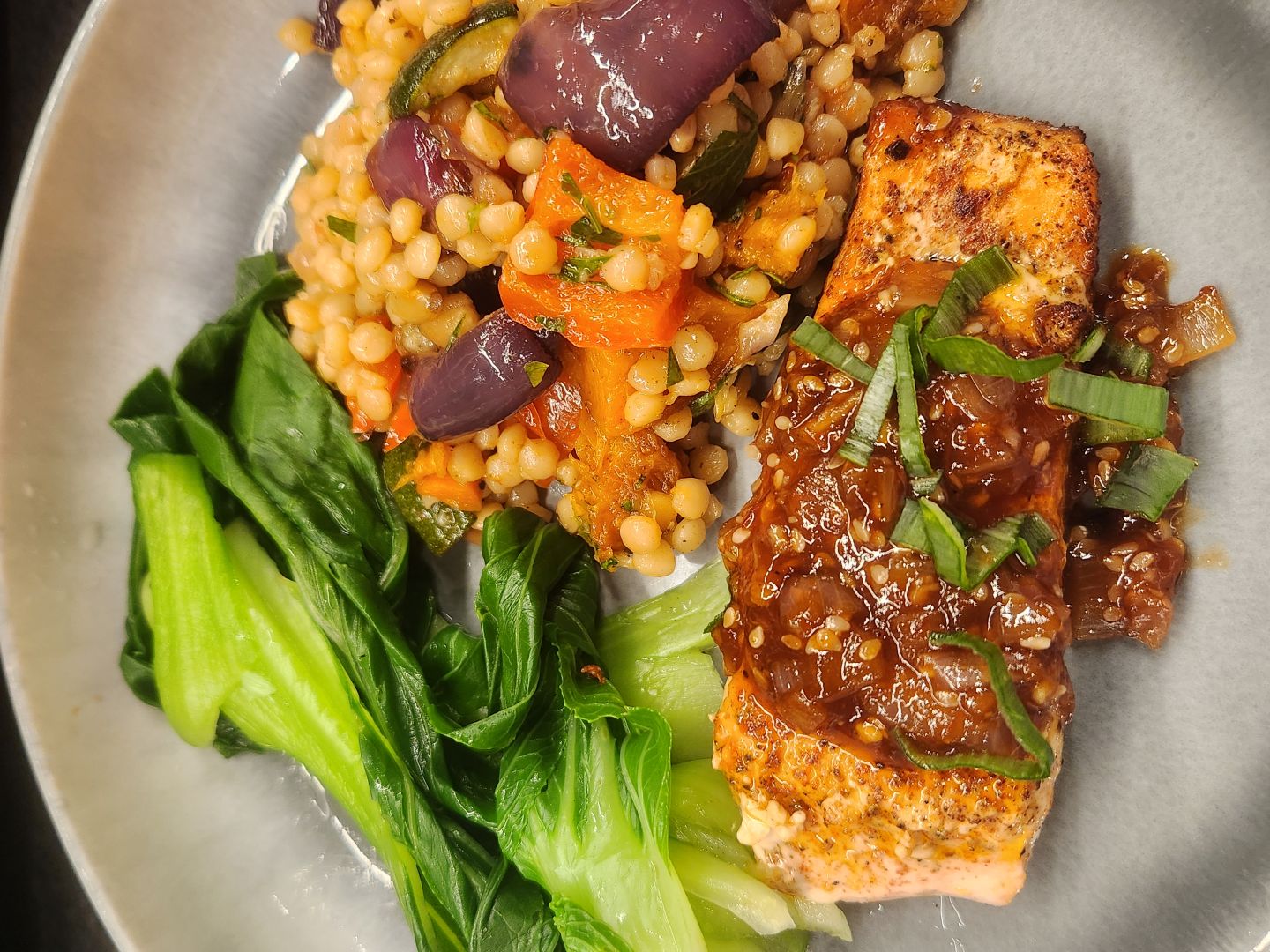 Heat the olive oil in a medium skillet on medium to medium-high heat. Season the salmon steaks with the everything rub. Place the salmon in the skillet and sear on both sides until cooked through, about 3 minutes per side. Serve each salmon steak with 1 Tbl of the Hoisin BBQ sauce.