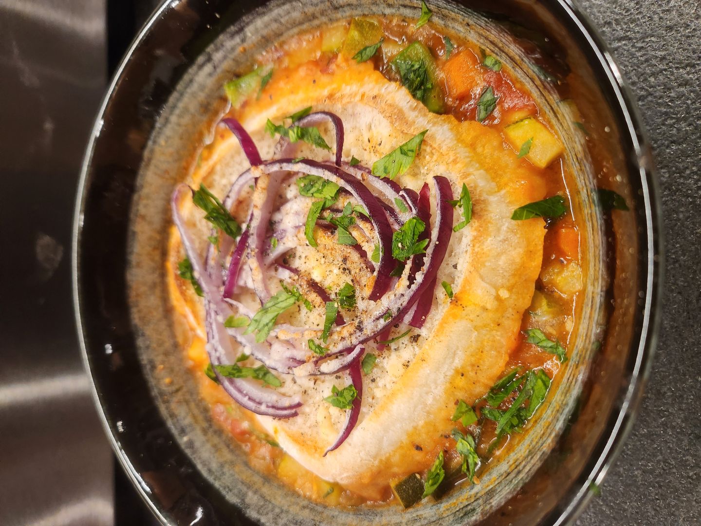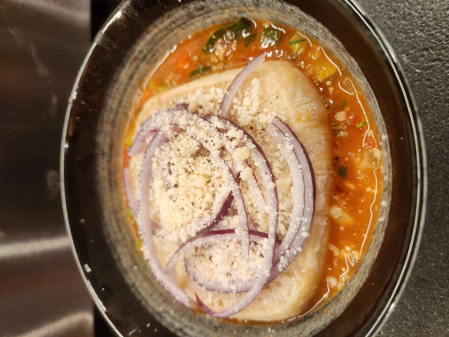 Optional topping: Preheat oven to 500F degrees. Right after spinach is cooked, add the bread slices on top of the soup in either a bowl which can handle 500F degrees or the original pot which can handle 500F degrees. Add the red onion, drizzle with olive oil and add Parmesan cheese on top. Cook in the oven until browned and crisp.