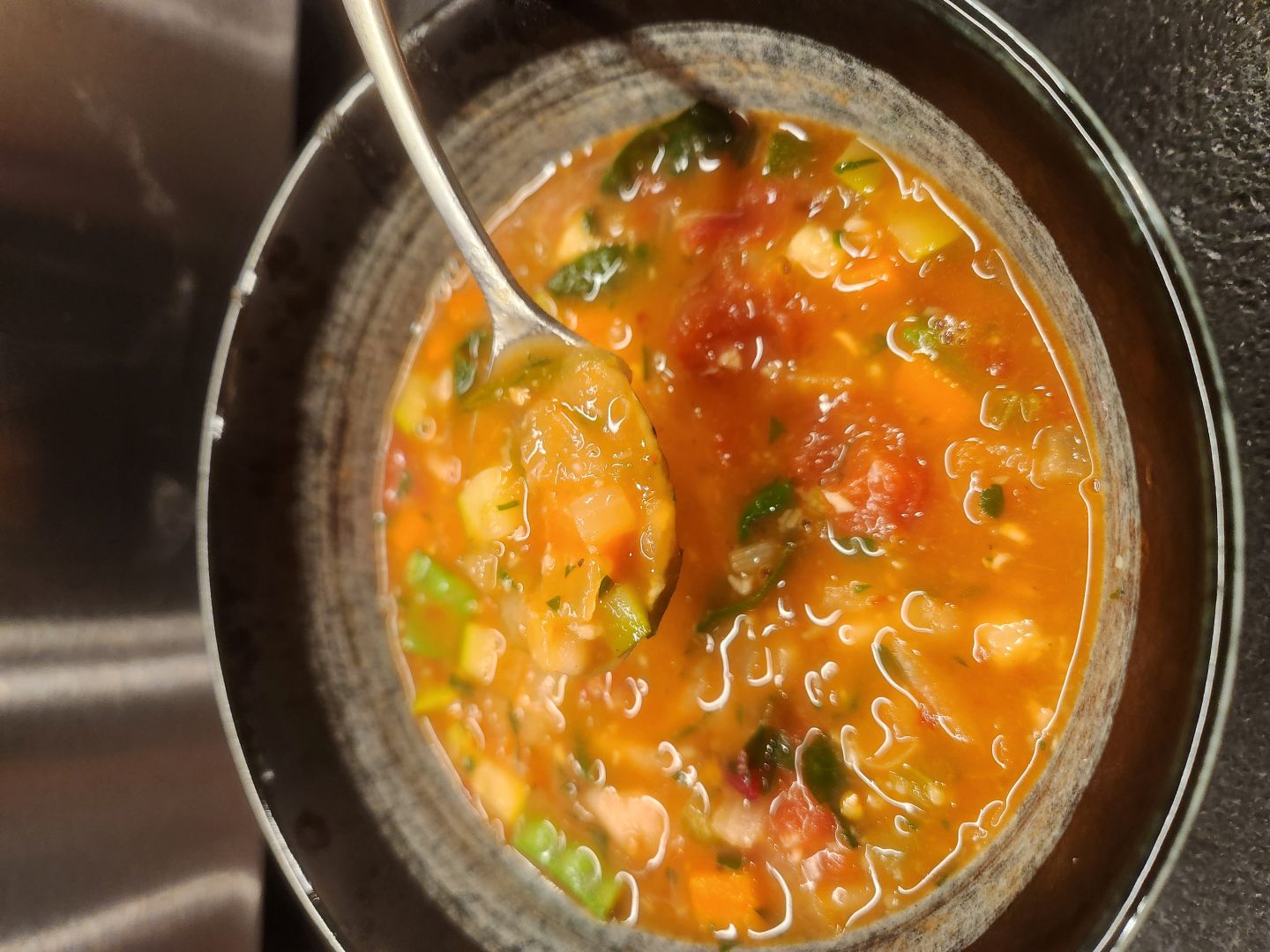 In a large stock pot on medium high heat, saute the onion, carrot and celery. When the vegetables are soft, add the garlic and herbs and saute for 1 minute. Add the chili flakes, Parmesan rind, chicken stock, tomatoes and beans. Bring to a boil and reduce heat to a simmer. After cooking 30 minutes, add the spinach and adjust seasonings.
