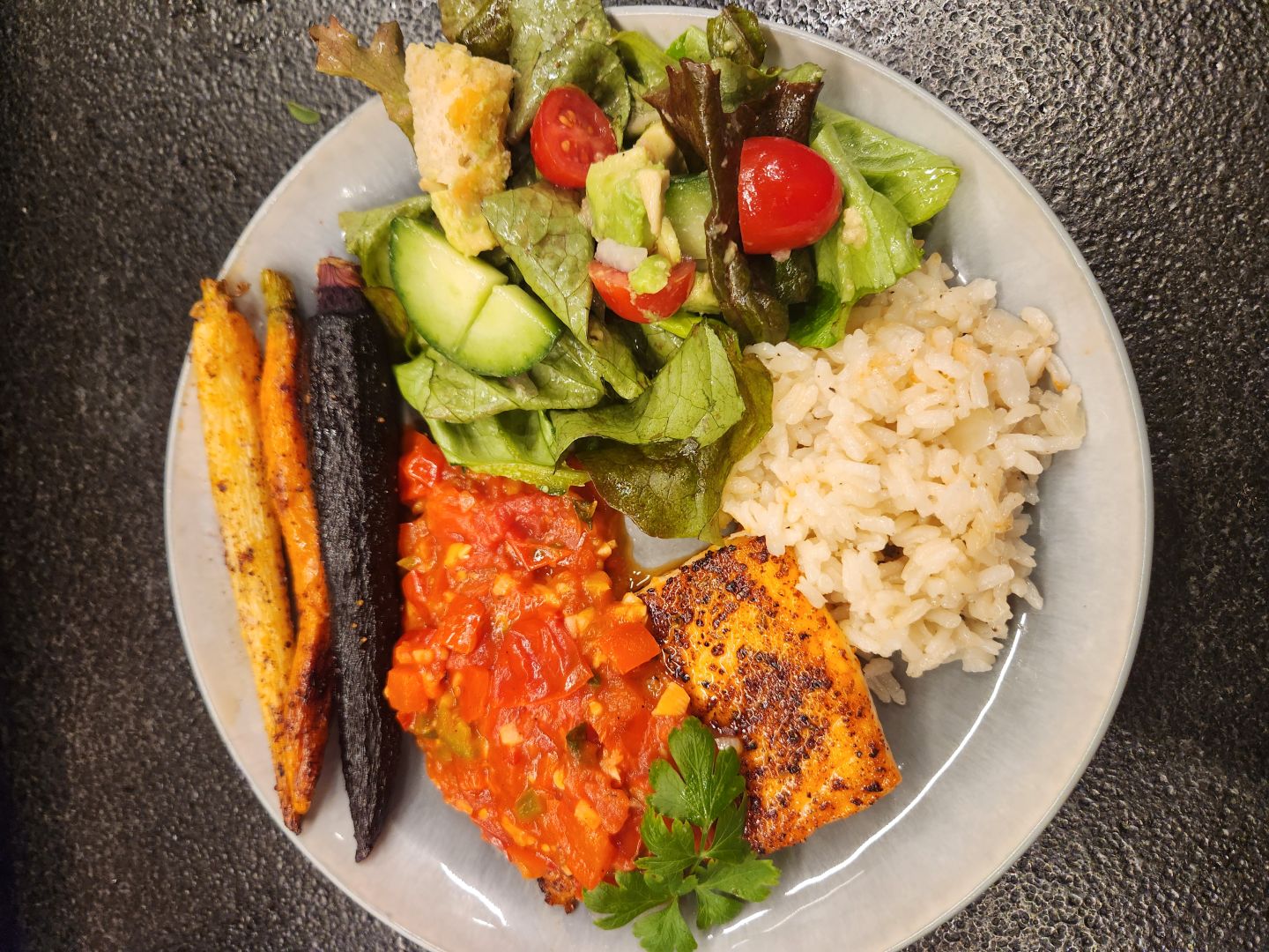 The tomato sauce is heavenly with a bit of kick and is a nice balance to the salmon that is nicely flavored with the everything dry rub. This make an easy, fast and delicious dinner for a busy weeknight. Serve over rice and add an air-fried green vegetable to make a full meal.